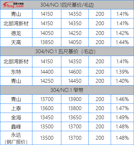 午后,现货依然在执行涨涨涨的模式,成交也是各种乱价中,电议成为主题,市场主流报价: 福建甬金四尺14700-15050元/吨; 广东甬金五尺14900-15800元/吨;宏旺、 北部湾、诚德等14650-14900毛基;德龙含税14400-14650元/吨基。