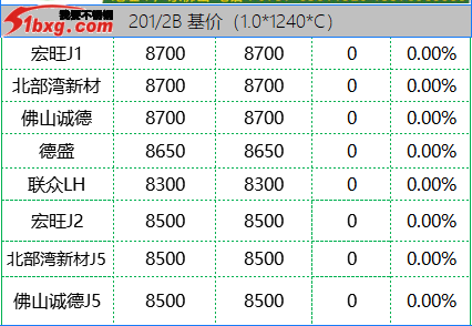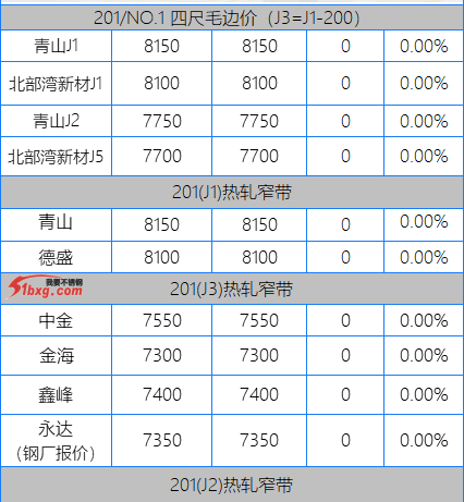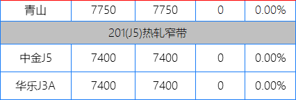 今日,青山代理报,J1-8150元/吨,J3-7950元/吨,J4-8650元/吨,J2-7750元/吨,交货期仍是3月10日前。市场贸易商整体报价波动不大,但价格依然有高低不一呈现。可见报价有,鼎信J2不含税报价7120-7150元/吨;北部湾新材报J5料7700元/吨,J1四尺8100元/吨,J1五尺8200-8250元/吨(期货8150);宝钢BN1TL窄带7600元/吨,大板7700元/吨;中金J3含税7530-7550元/吨;中金J5料、金海J3料、鑫峰J3料、永达J3料7380-7500元/吨。